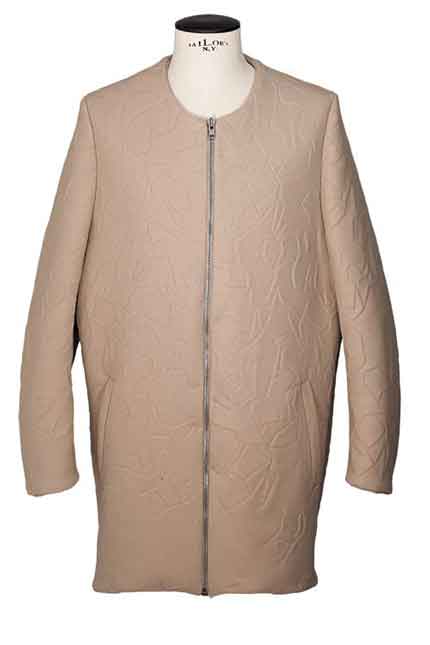 This coat is made out of camel colored virgin wool bonded with a neoprene like fabric that was quilted with the M90 swedish camouflage pattern. The coat closes with a full-length metal zip in the front and has two welt pockets. The fit is slightly egg-shaped.